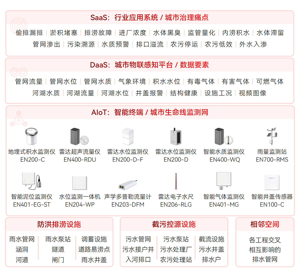 對排水設施(雨污水管網(wǎng)、窨井蓋、截流泵站、提升泵站、抽水泵站、農(nóng)村污水處理站、溢流井、排水井、污水處理廠、調(diào)蓄設施等)關鍵節(jié)點、易澇積水點,河湖水位、流速,管網(wǎng)液位、流速、水質(zhì),內(nèi)澇積水等指標進行實時數(shù)據(jù)監(jiān)測,形成設施完整、拓撲清晰、位置準確的排水設施“一張圖”,為排水空間規(guī)劃、設計、排水設施改造提供決策支持。